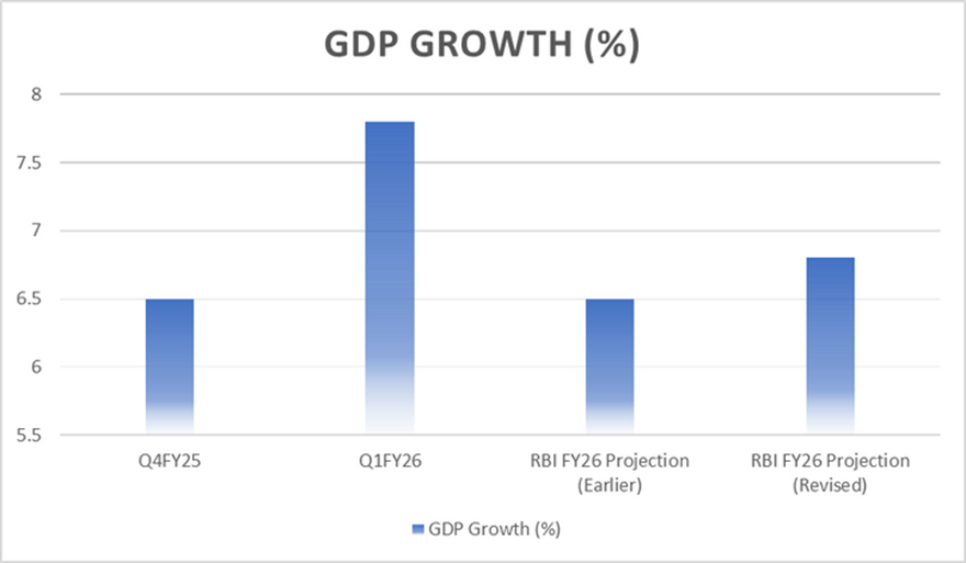 India’s Economy posted a surprisingly humungous growth in the Q1FY26 at 7.8% between July-Sept 2025 period. The Central Bank has projected India’s GDP growth for FY26 to 6.8% from 6.5% (earlier guided).